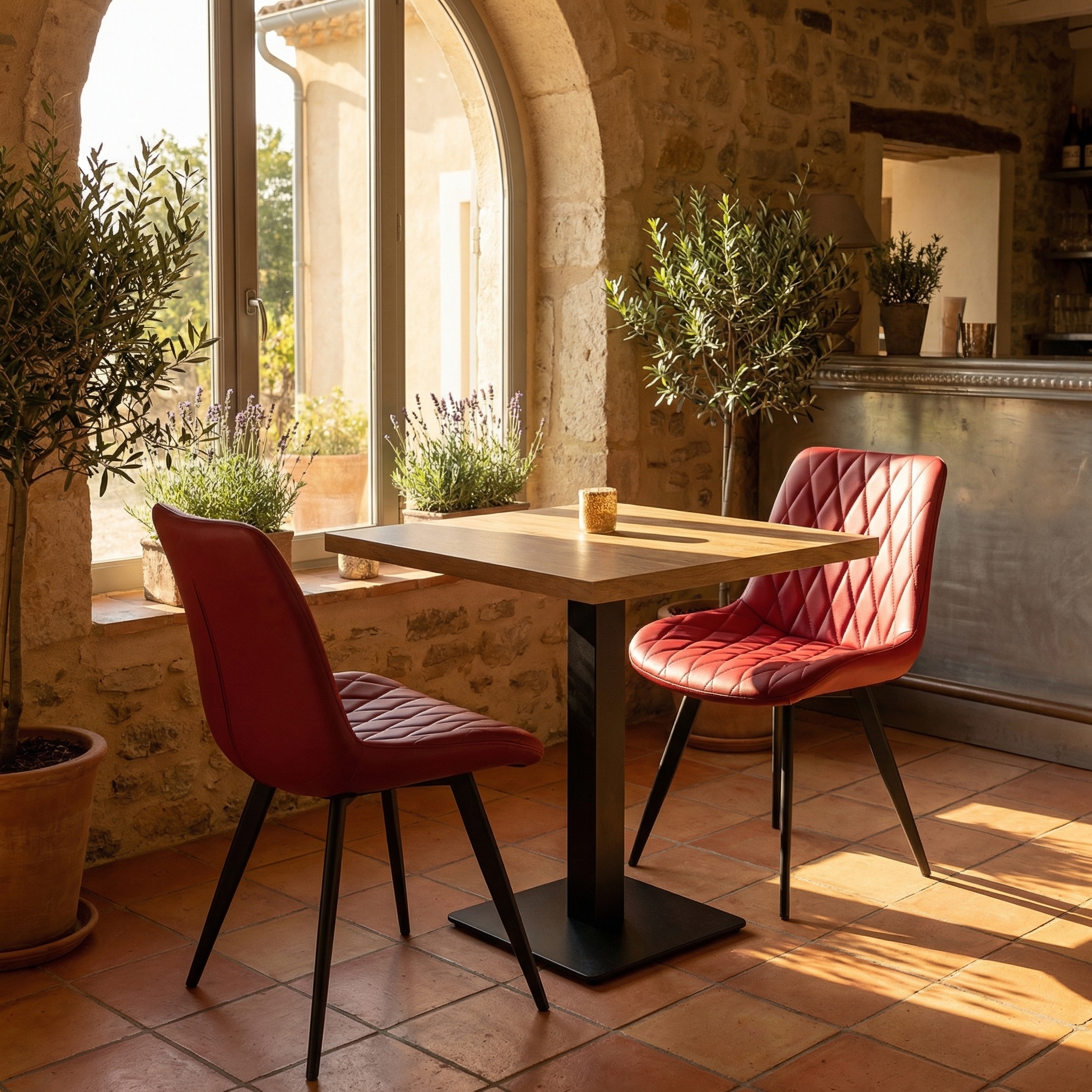 Diese exklusive Restaurant Sitzgruppe vereint Funktionalität, Langlebigkeit und stilvolles Design – ideal für Restaurants, Cafés, Bars oder Hotels. Das Set besteht aus einem robusten Restaurant Tisch Andora in Eiche (60x60 cm) und zwei bequemen Restaurant Stühlen Scarlet in Rot.