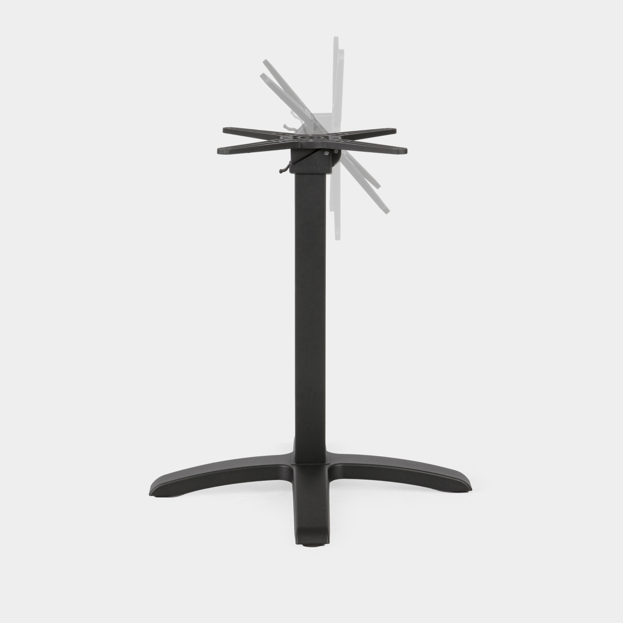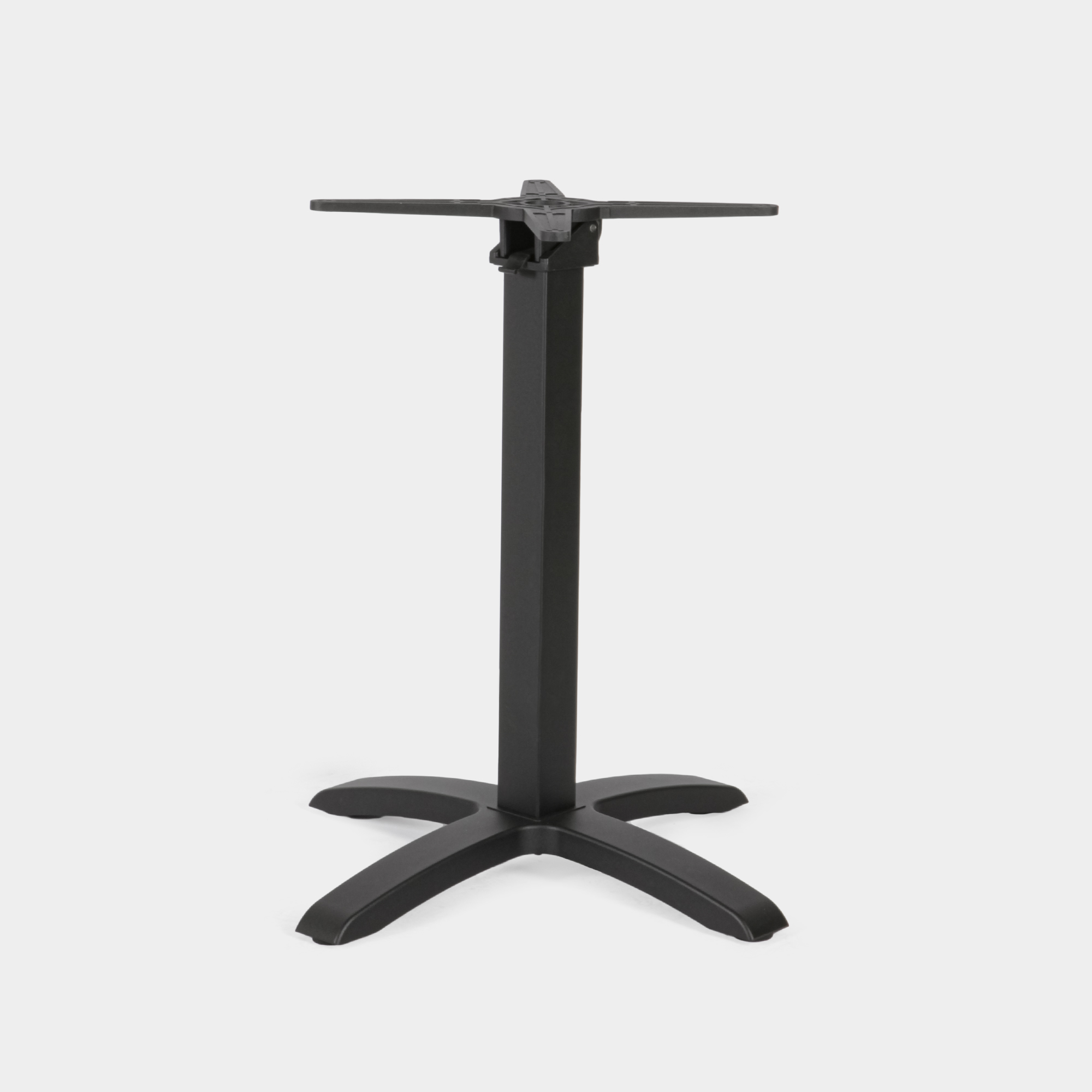 Dieses Tischgestell wurde speziell für den Einsatz in gastronomischen Einrichtungen sowie im Innen- und Außenbereich konzipiert. Die Konstruktion besteht aus einem Kreuz- und Säulenelement aus hochdruckgegossenem Aluminium sowie einem Sockel aus Gusseisen. Die Oberfläche ist mit einer elektrostatischen Pulverbeschichtung versehen und in der Farbe Schwarz erhältlich – für eine langlebige, korrosionsbeständige Nutzung.