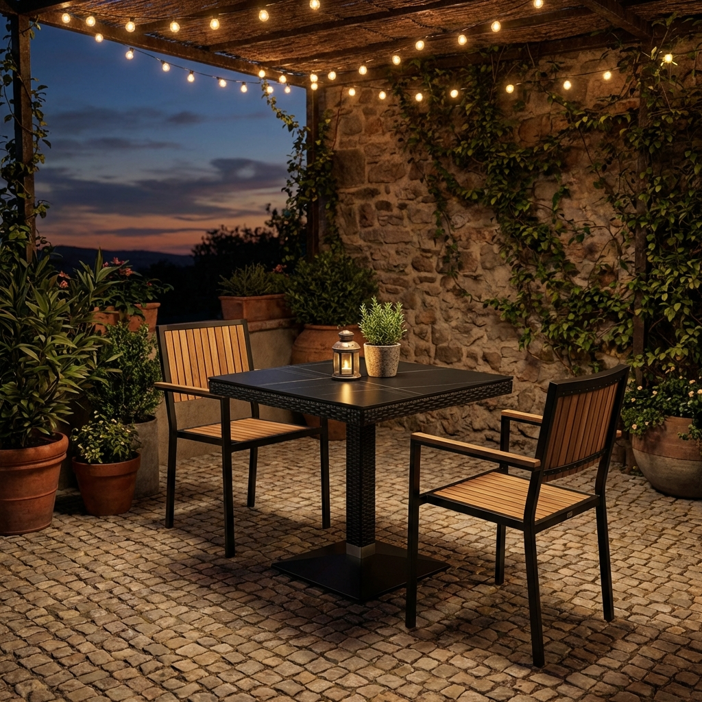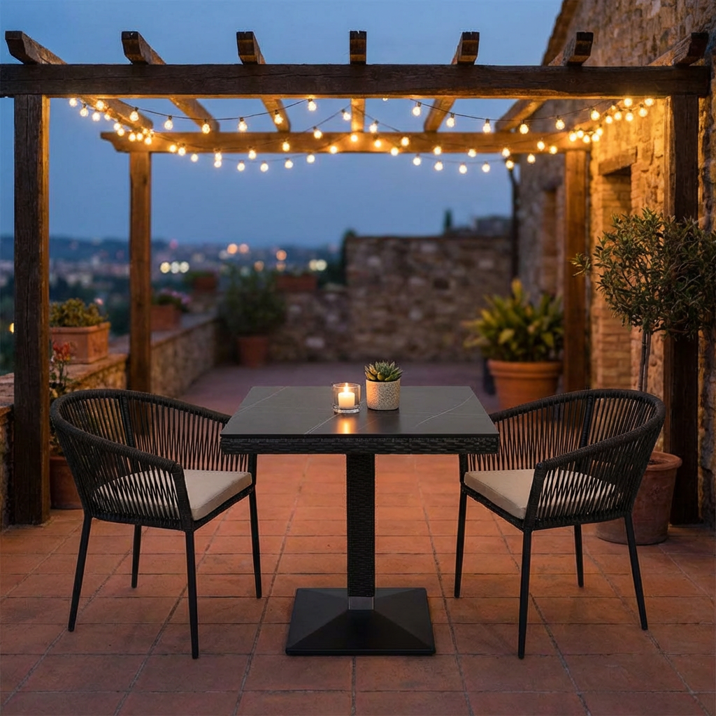 Die dunkle, elegante Farbgebung in sehr dunklem Braun fügt sich harmonisch in moderne wie klassische Gastronomiekonzepte ein. Der Tisch ist optimal kombinierbar mit dem Stuhl Verona und unterstützt eine flexible, professionelle Bestuhlung im Außenbereich.